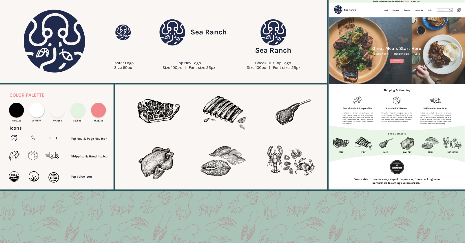 Created visual identity for Sea Ranch, a meat and seafood raw ingredient delivery service, through custom branding design, including a distinctive logo, icons, comprehensive style guide, and visually appealing website design.